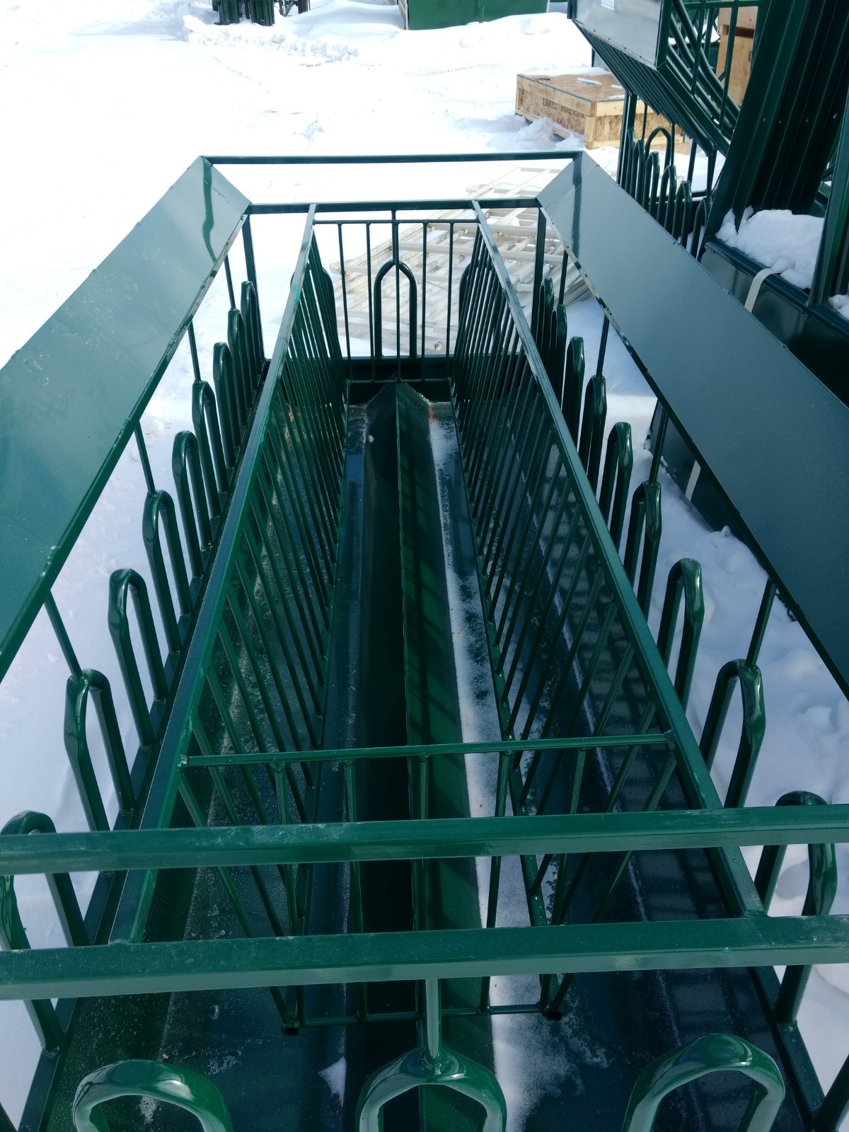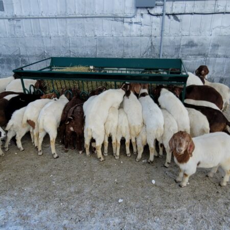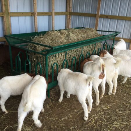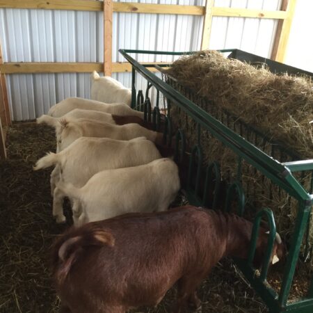 The goat feeder has worked out well for the sixteen ladies. The hay offers easy access and avoids spill over onto the ground as promised. Grain fits nicely into the trough as well. I was concerned about the dominant goats taking advantage of the timid goats when their heads are in the feeder. This has proved to not be a problem since extra slots readily attract the greedy. I am also pleased the feeder design prevents even the most acrobatic tribe member from getting over the outside guard.