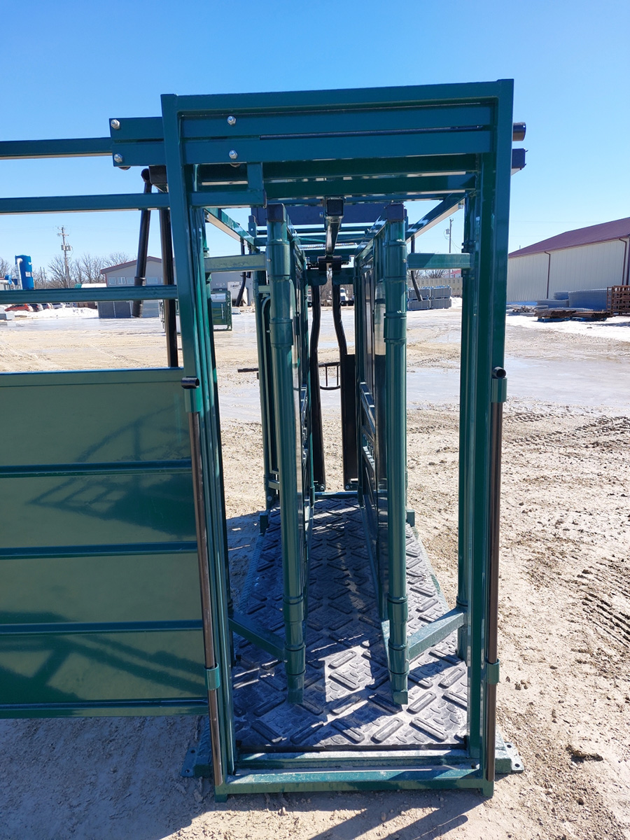 Built from rugged steel, this squeeze chute features a top-mounted control lever, drop-down panels, and a full side-access door. Its compact design makes it ideal for portable use or tight permanent setups.