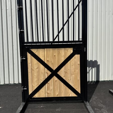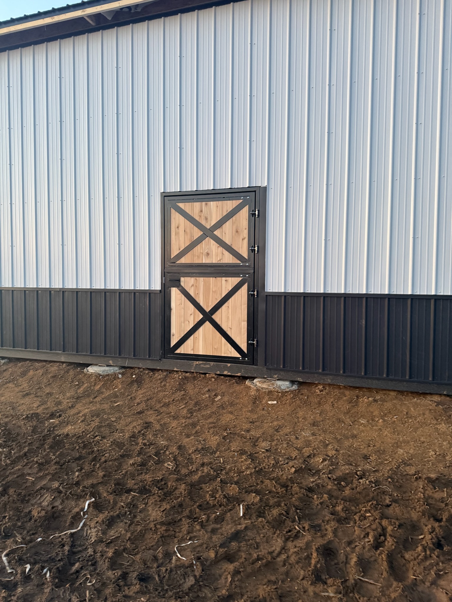 Hardware is horse-safe and built for outdoor duty. Adjustable heavy hinges, secure latches, and strike plates with smooth edges.