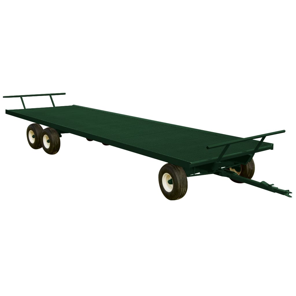 The Lakeland Farm Boss Flat Rack with 6 Wheel Wagon is built for heavy-duty farm use, offering a reliable solution for hauling round and square bales. Designed with 10-inch heavy-duty longitudinal beams (upgraded to 12-inch beams on the 36-foot model) and heavy-duty formed steel cross bars spaced every 16 inches, this bale wagon is ready for long days in the field. The 3-pound expanded steel mesh or 1/8-inch checker plate deck provides a durable surface for transporting bales. Available in widths of 8 ½’ and lengths ranging from 20’ to 36’, it comes with removable front and rear slant end gates for added convenience. This flat rack also features a heavy-duty formed steel rub guard on the sides to prevent wear and tear.