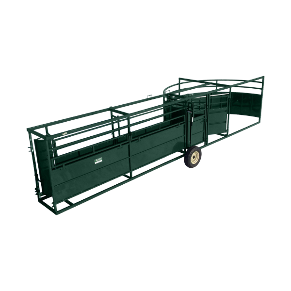 This fully portable system combines an 8.5ft Cornerless Crowd Tub with a 17ft Adjustable Alley in a heavy-duty one-piece construction. The alley includes easy fold-down access doors for working on smaller animals and a vet access door at the front. The crowding tub features a 3-way exit and auto-locking sheeted rolling door between the tub and alley. With removable wheels, retractable hitch, and fork targets for easy transport, this system ensures efficient and smooth cattle handling in any environment.