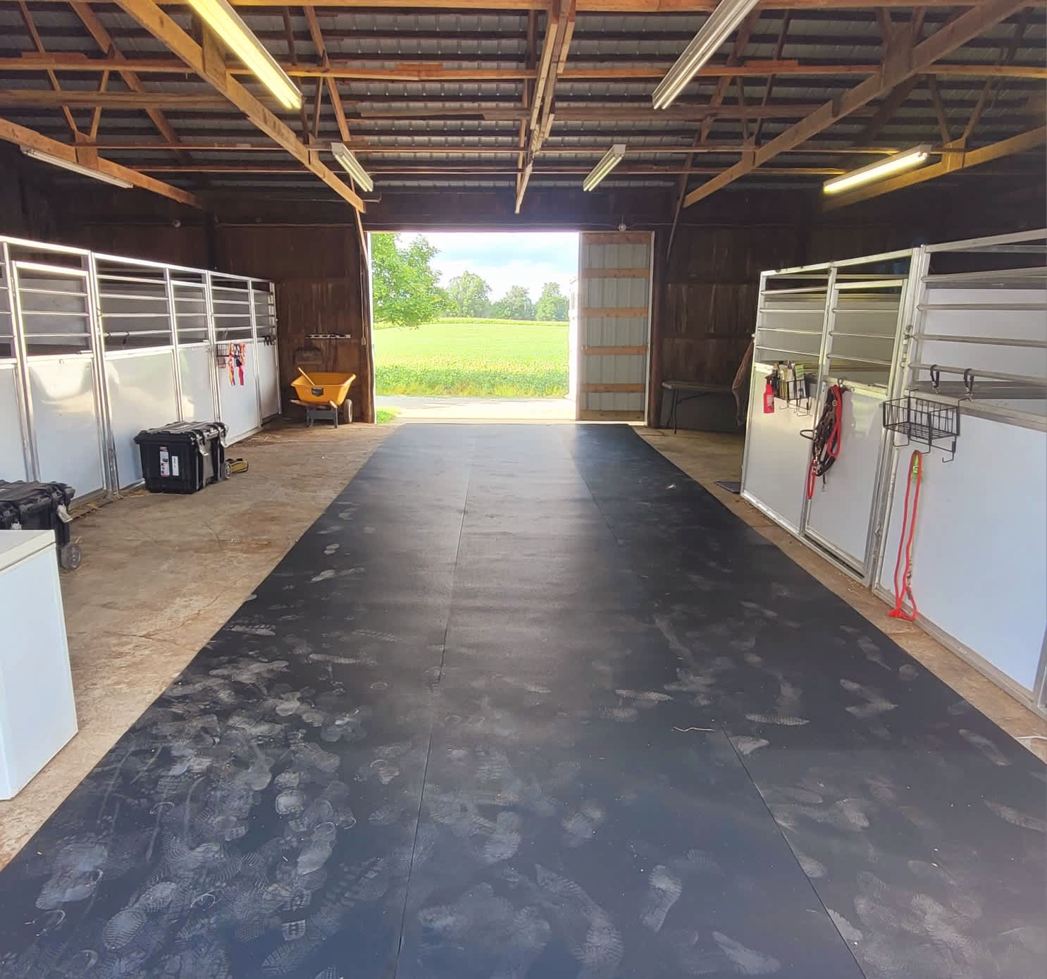I leased out 10 portable box stalls to a local event. We installed them in a line of 10 backing up to permanent stalls in a large barn. We were able to drive right up to the install. Everything we needed fit into a 3 horse slant trailer. Loaded by 2 guys and unloaded and put together in 45 min each way. Easy as can be! We had no trouble putting it up quickly and efficiently…..I was told that the stalls were admired by the owner of the farm so I hope they either rent again as it’s close. We are storing them upright and separated by group for easy picking when the need comes to do whichever configuration.