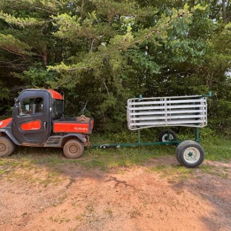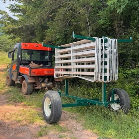 The Portable Panel Carrier is designed to transport approximately 50 aluminum 8′ Easy Panels, making it an essential tool for setting up and moving your livestock handling system efficiently. Built with a durable 3” x 3” square tube frame, this carrier provides the strength and reliability you need in the field. It comes equipped with a clevis hitch and a jack on the front for easy attachment and leveling. The carrier’s dimensions are 15’ long by 8’ wide, offering ample space for panel transportation. Standard with used truck tires, this panel carrier is designed for smooth transport, with an optional upgrade available for tire customization.