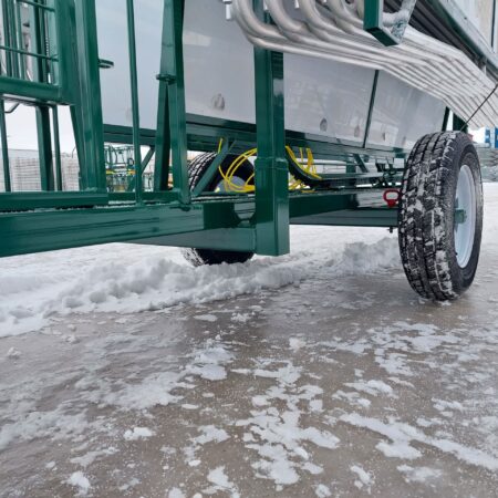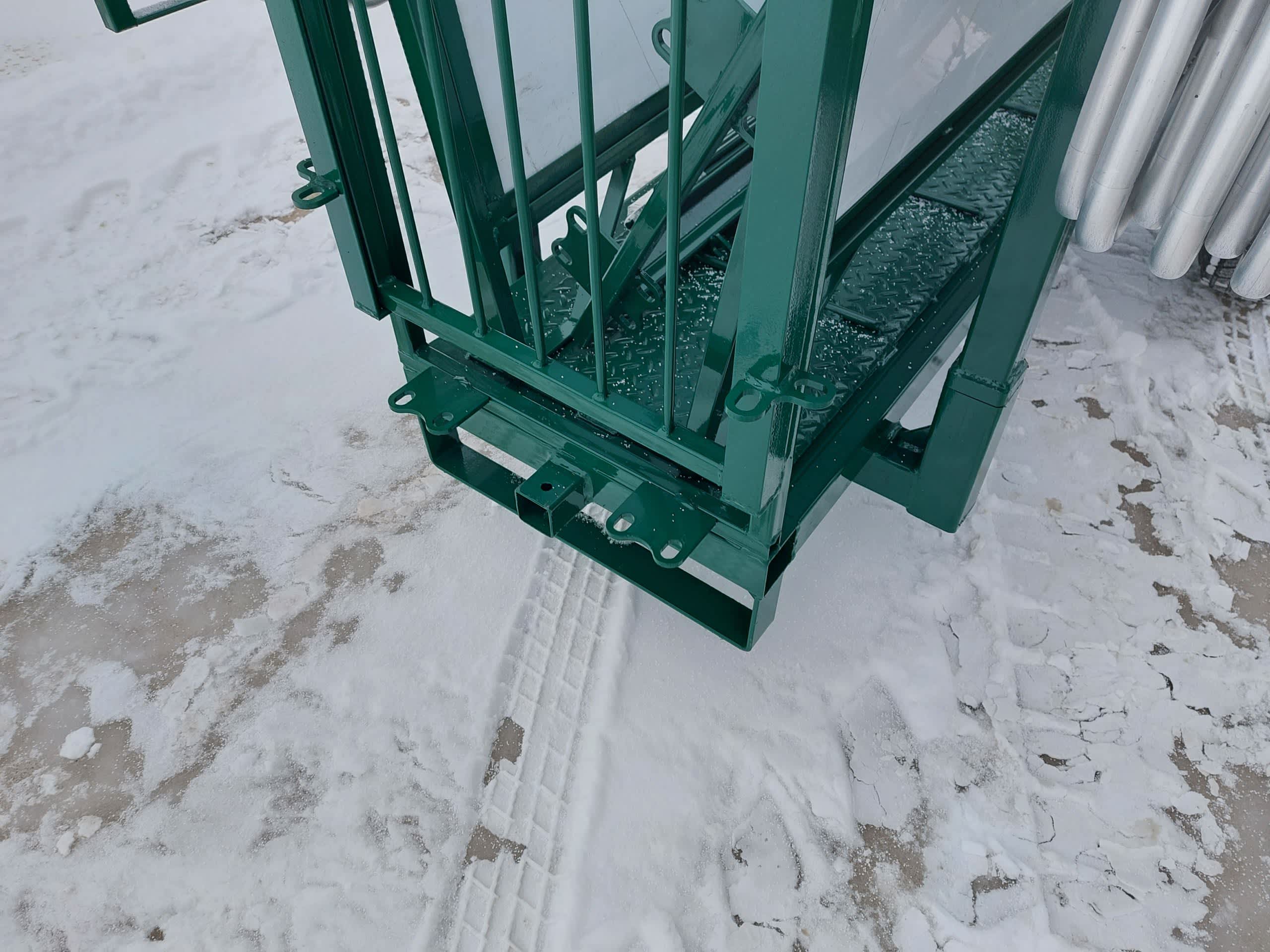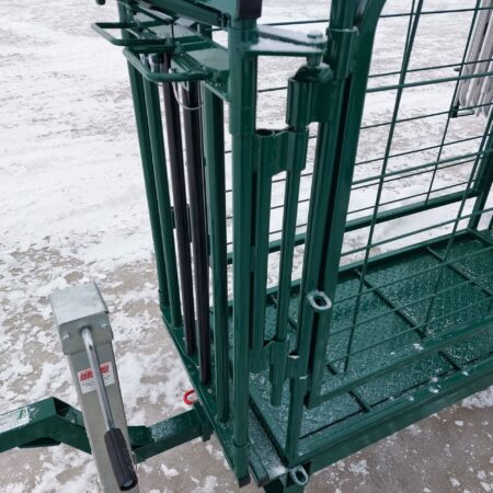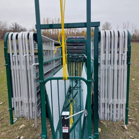 This portable system also includes 20 8-foot aluminum Easy Panels with connecting pins, an extra guillotine gate, and a set of removable wheels with a 2” ball hitch for easy transport. A 7,000-pound removable jack and ratchet strap complete the package. The handler is compact when in transport mode, measuring 16 feet long (including the hitch), 53 inches wide, and 84 inches high, making it easy to tow and set up in any location.