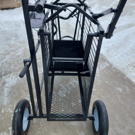 The Lakeland Small Portable Calf Chute is designed for safe and humane handling of calves up to 150 lbs. Featuring gentle restraint for easy dehorning, tagging, and tattooing, this chute helps prevent discounts on improperly handled calves. The unique tailgate provides easy access for quick castrating, and the built-in dial scale offers accurate birth weight readings. Mounted on adjustable large tires, it’s portable across various terrains, making calf handling easier and more efficient for one person.