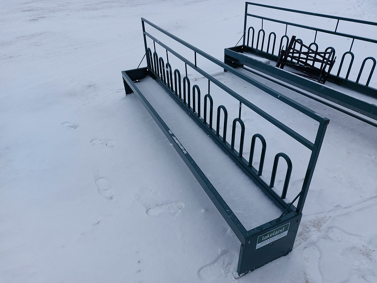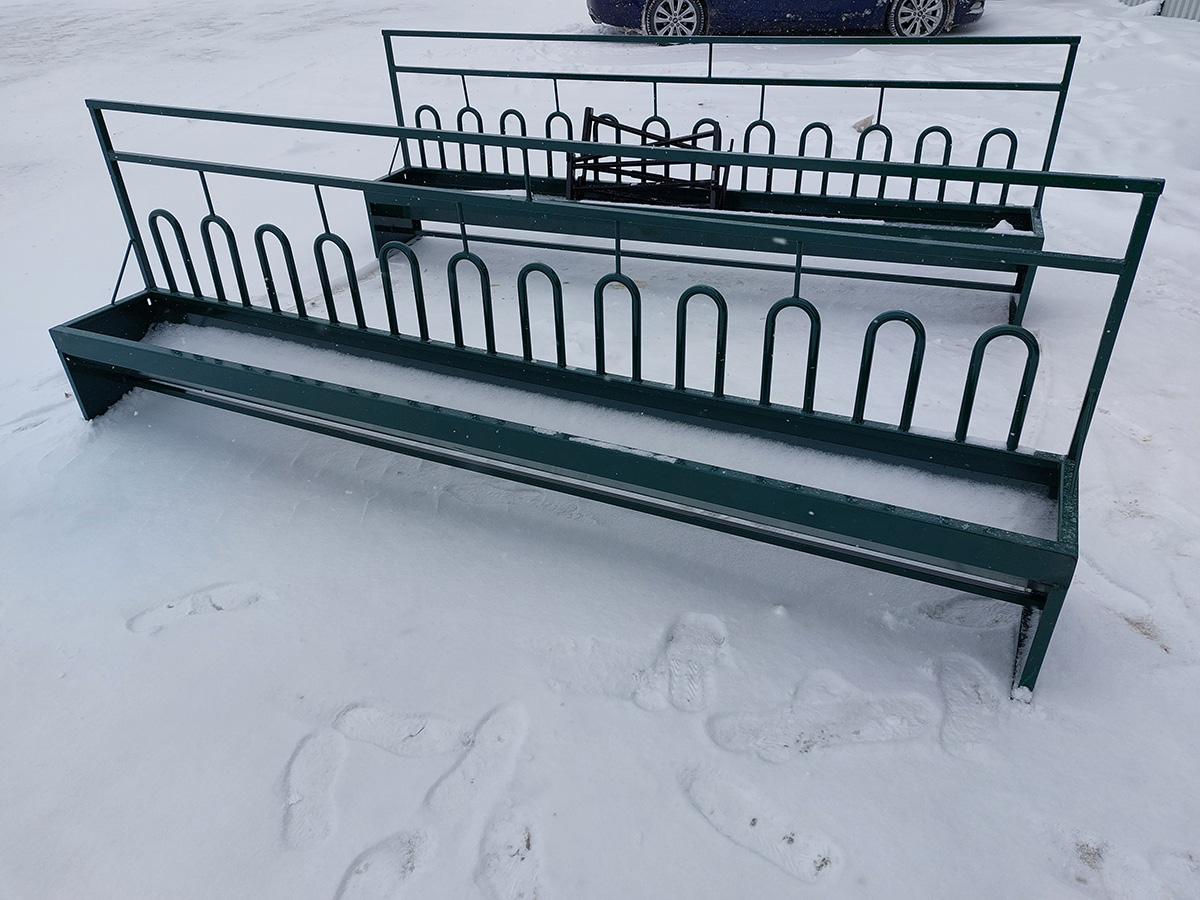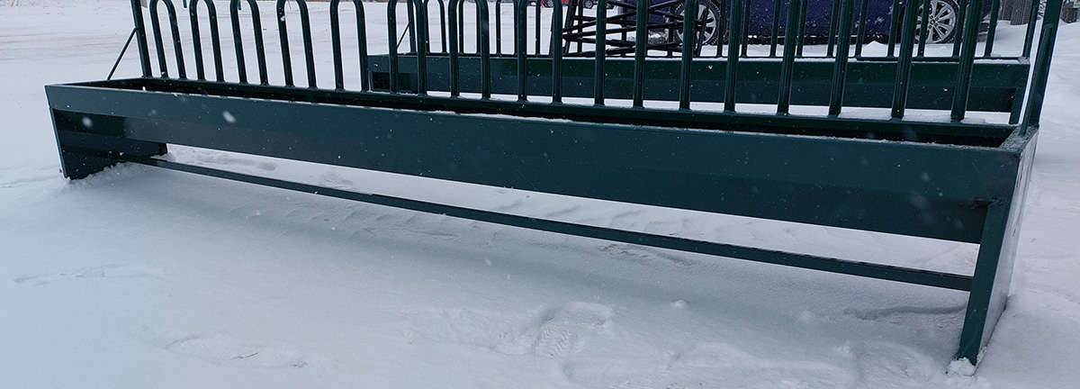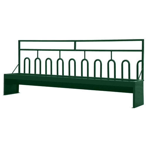 Bunk Feeder with 10 feeding spaces (available as tombstone or slant bar)* Works as a free standing unit or can be attached to make a feed front. Feeds hay & grain.