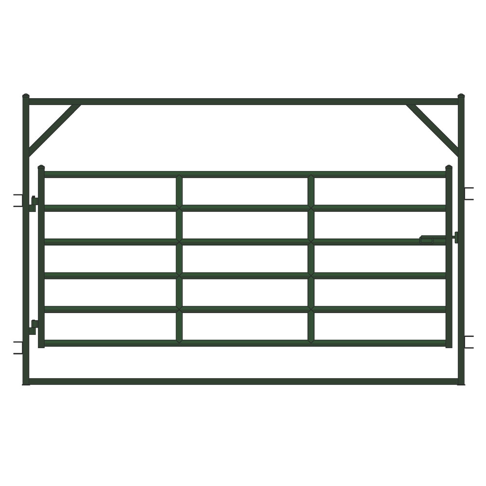 The bowgate features a green powder-coated finish to resist rust and extend its life in harsh farm environments. Double pin clips/brackets are included at both ends, ensuring a secure attachment. Weighing 256 lbs, this gate is easy to set up and move around, offering flexibility for various farm tasks. Two solid rod connecting pins are included with each bowgate to ensure stability.