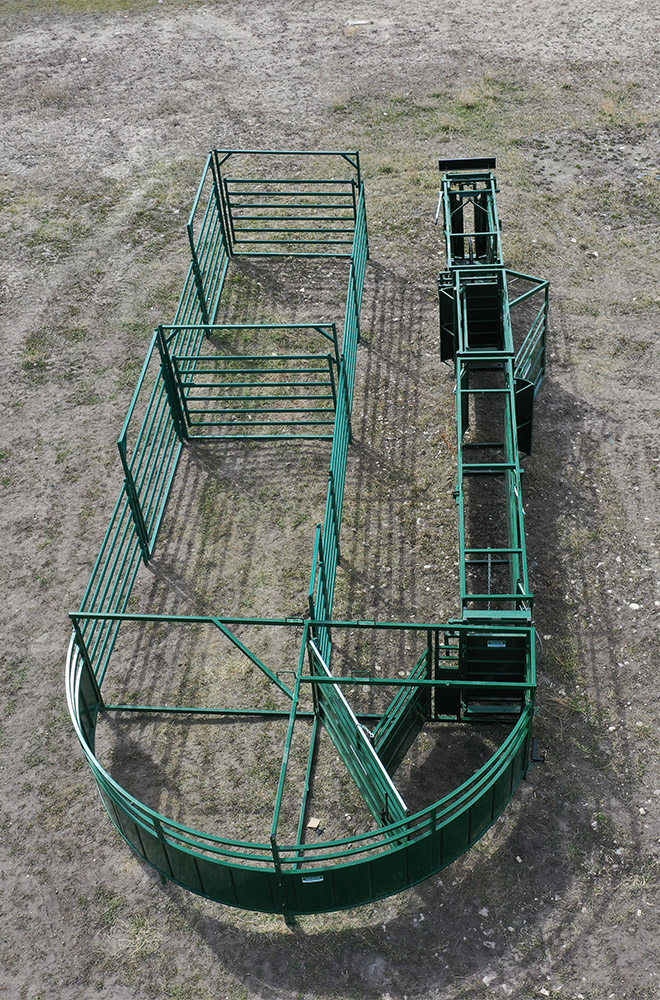 Corral Panels and Bowgates: Finally, the system includes five 10 ft corral panels, four 10 ft bowgates, and one corral panel with a 4 ft man gate. Altogether, these components allow flexible setups for various herd sizes and handling needs.