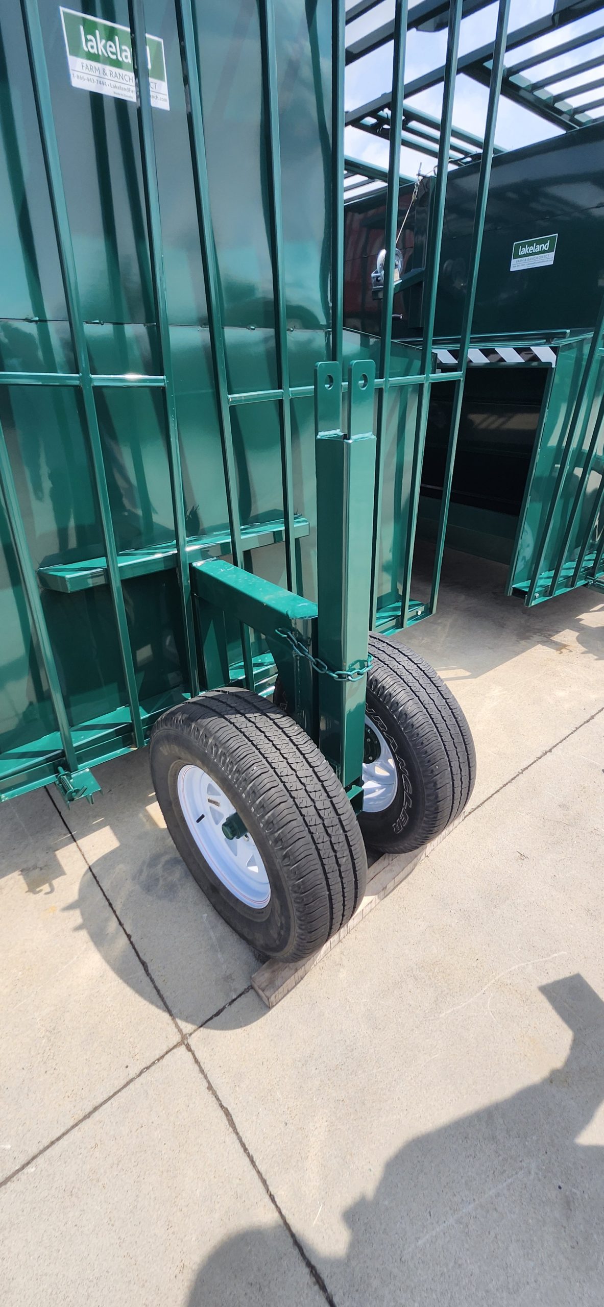 The 5 Ton CreepMaster Creep Feeder with Creep Pens (Portable) is designed to efficiently feed up to 100 head of cattle, while keeping calves and cows separated for optimal feeding. This portable feeder is equipped with 16″ used truck tires on new rims and features a dolly-style front wheel setup, allowing for tight cornering and easy steering. Built with a 14-gauge mig-welded construction and double-sided feeding, it offers adjustable feed flow and a blower fill pipe for quick refilling. The calf creep pens, which measure 7′ deep by 12.5′ wide on both sides, flip up and down easily using a hand winch, with a transport lock to secure the pens during transport. The calf creep gates have adjustable openings at 14.5″, 12.5″, and 10.5″, with an easy-to-move spring-loaded adjusting bar for flexibility. The rain roof slopes 22″ with a 1.5″ drain lip, keeping the feed dry. The trough, measuring 17″ wide by 12″ deep, sits 28″ from the ground. With overall dimensions of 14.5′ long, 94″ wide, and 92″ high, and an empty weight of 3,400 lbs, this feeder is built tough for portability and long-term use.